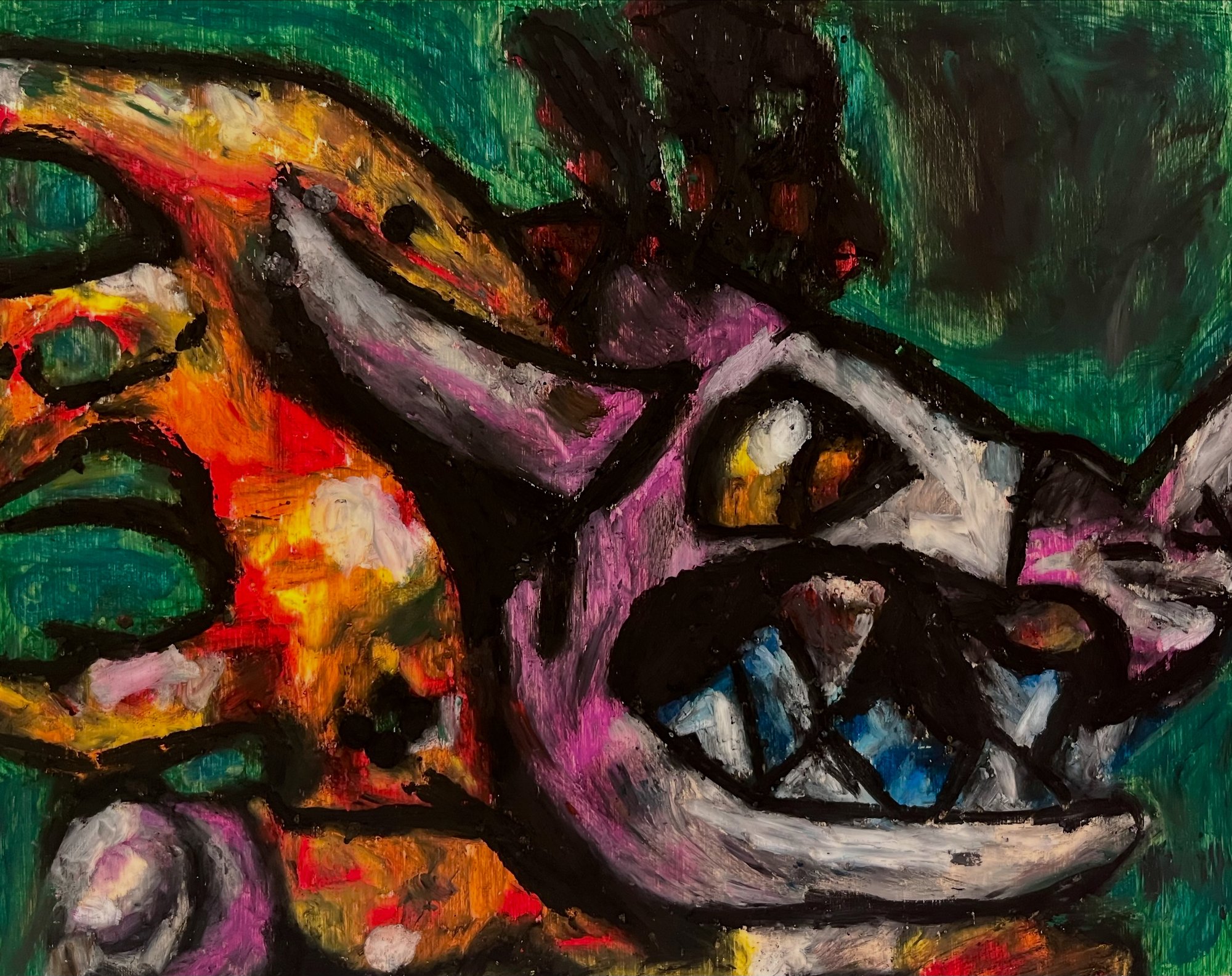 Metal Greymon, 8in x 10in, pastel on wood. 2025